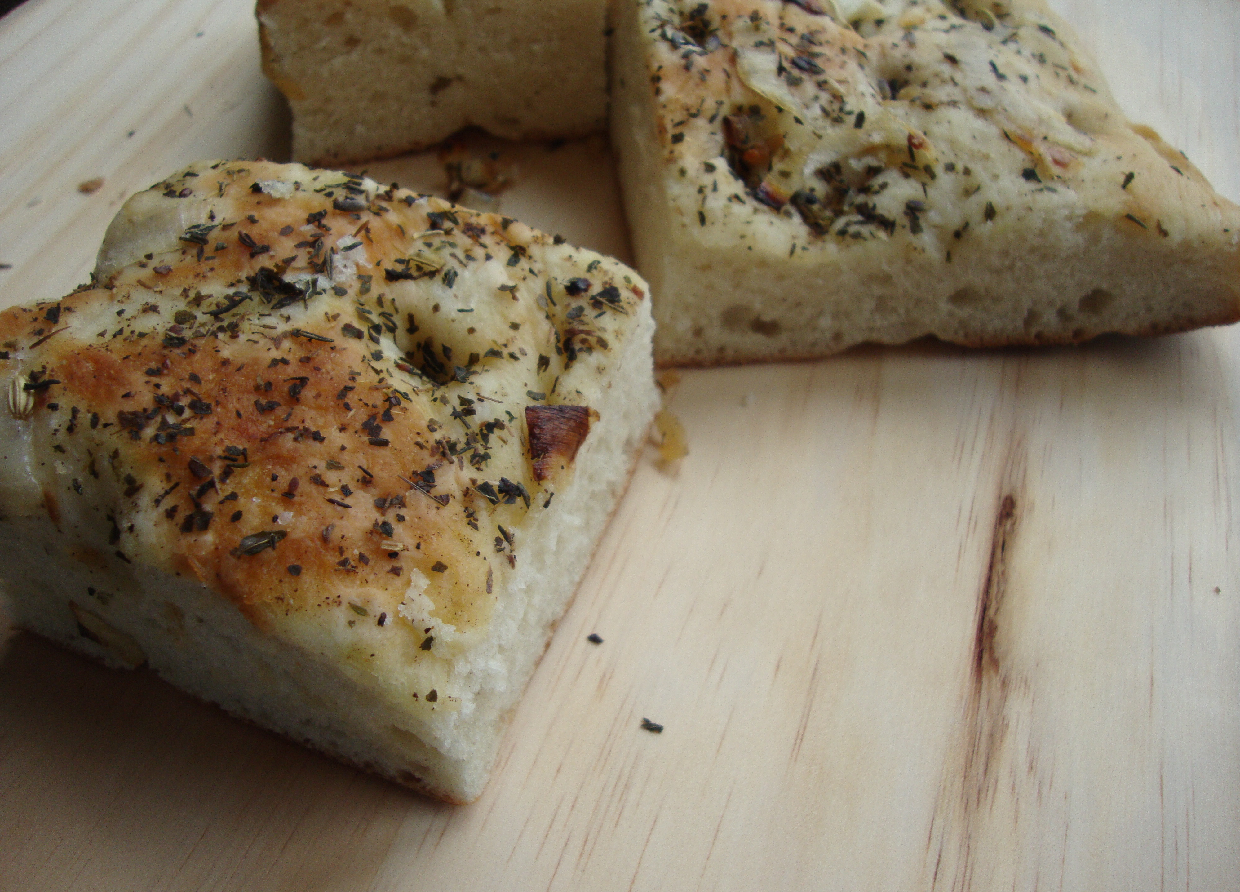 I thought about halving this recipe, because I was wondering what just the two of us were going to do with so much bread, but I figured, its only flour and water so I might as well make the whole thing and then freeze what we don’t use. Well of course I should know by now that bread will never go to waste in this house! John actually cut the focaccia down the middle and made a wonderful looking sandwich for lunch. I included a variety of ideas for topping this bread, because it is very adaptable. I went with a few caramelized onions, fresh minced garlic, salt, pepper and Herbes de Provence, but I think next time I would up the caramelized onion to a full small onion, because I barely noticed the flavor. As soon as the weather gets nicer I can’t wait to use some fresh rosemary from my porch garden, mixed with some lemon zest to the mix to give it a summery feel. I don’t really think you can go wrong with whatever you put on this bread – so have fun!